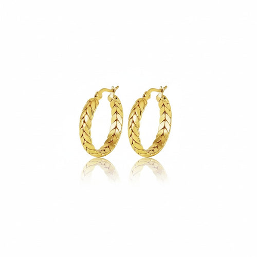 עגילי חישוק טקסטורה עלים דגם 'לונה', ציפוי זהב על פלדת אל-חלד - L316 עמידים במים